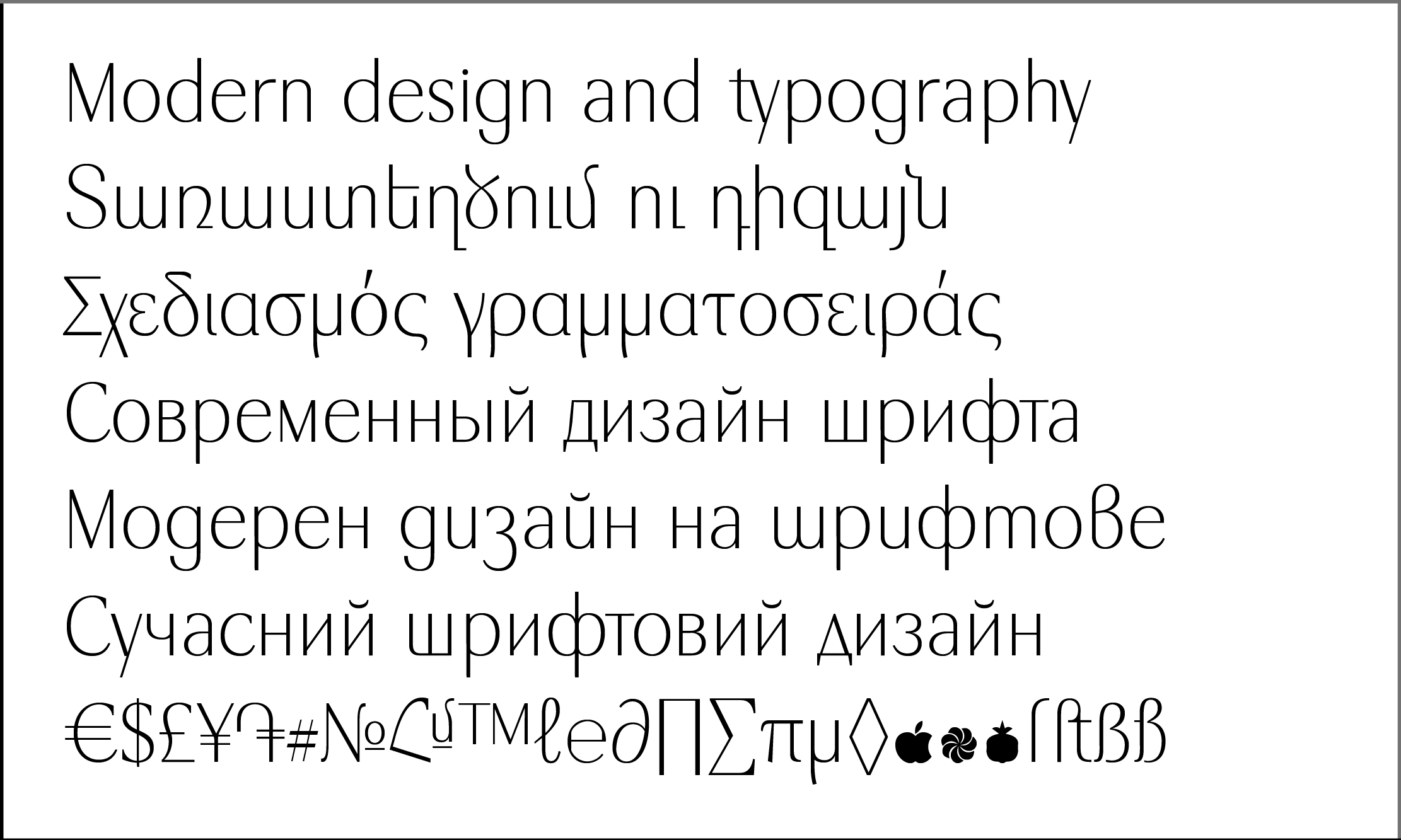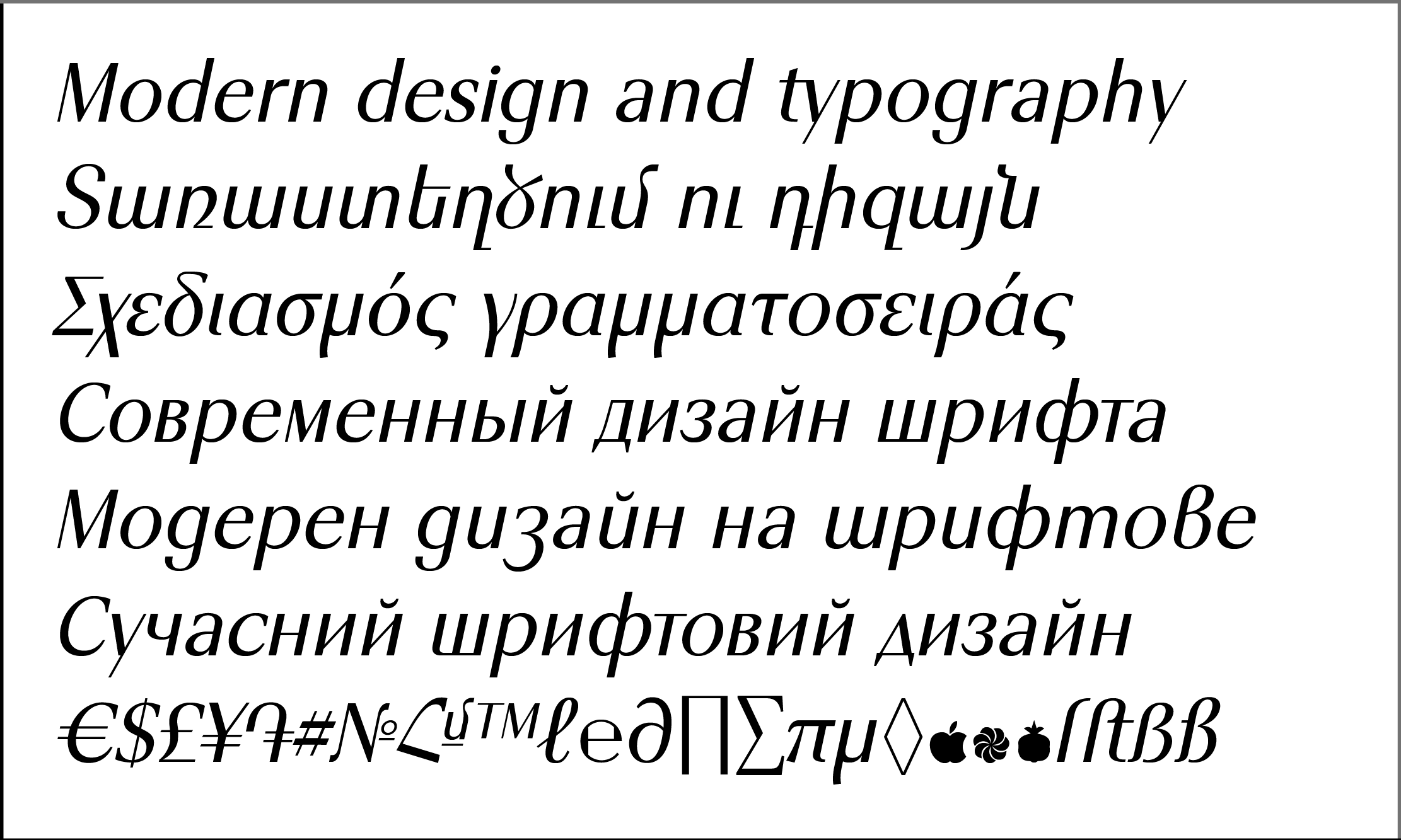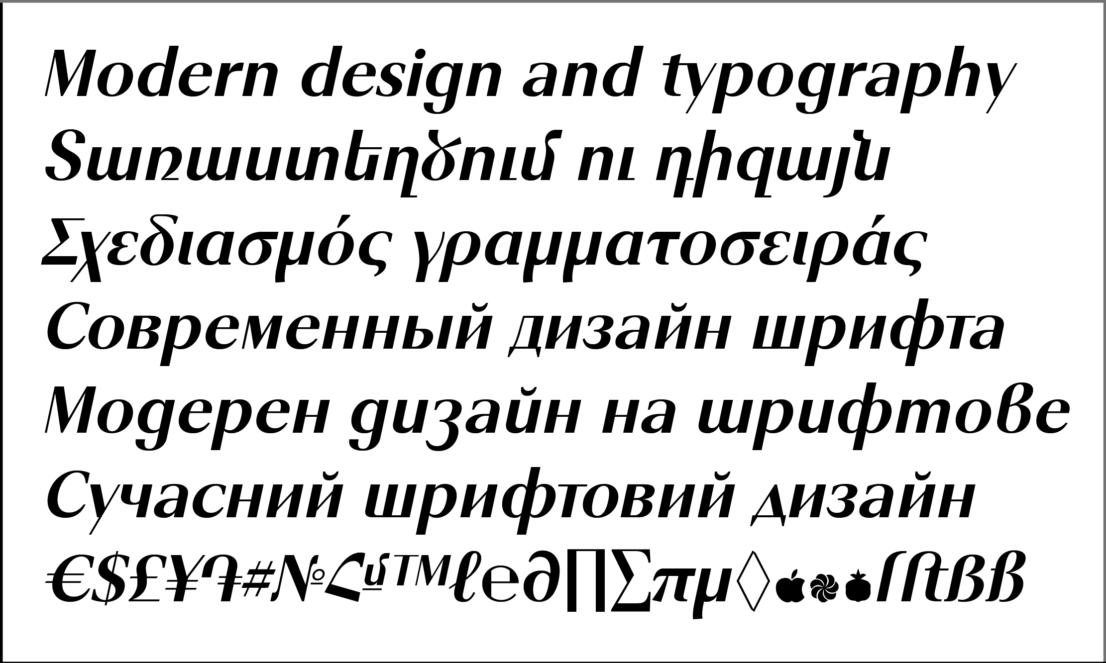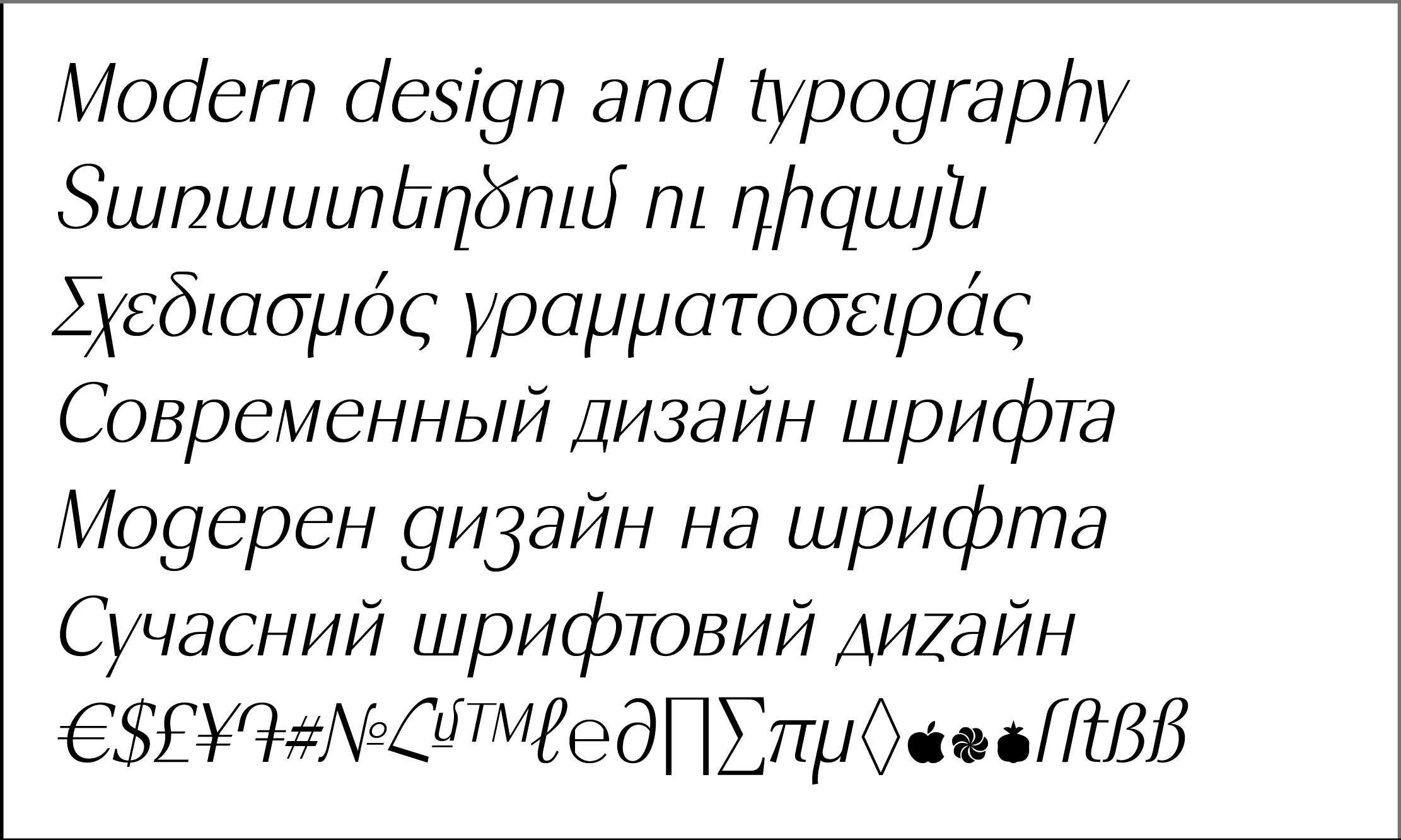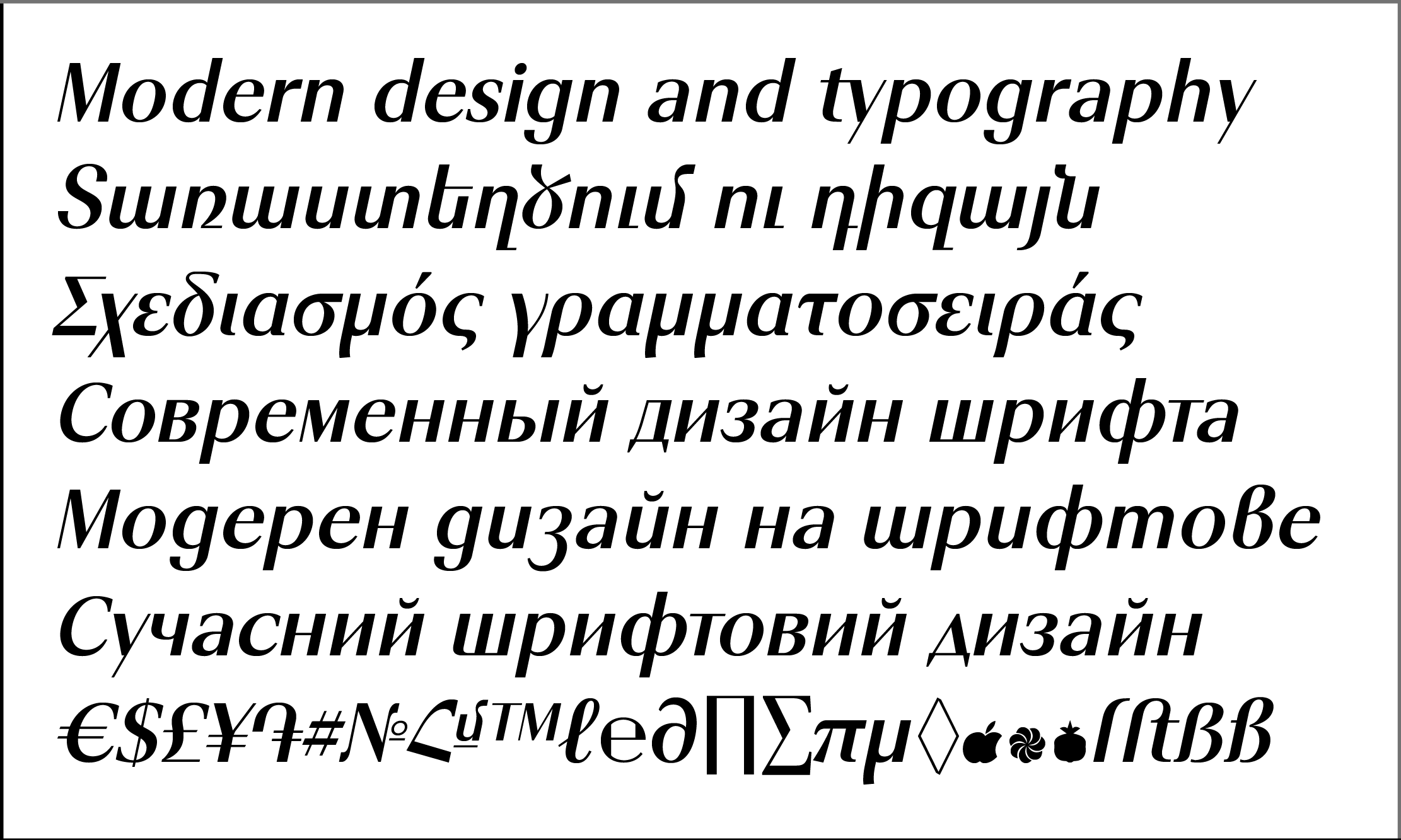 The font includes 8 apright +8 Italic styles, Basic and many Advanced Ligatures for Latin and