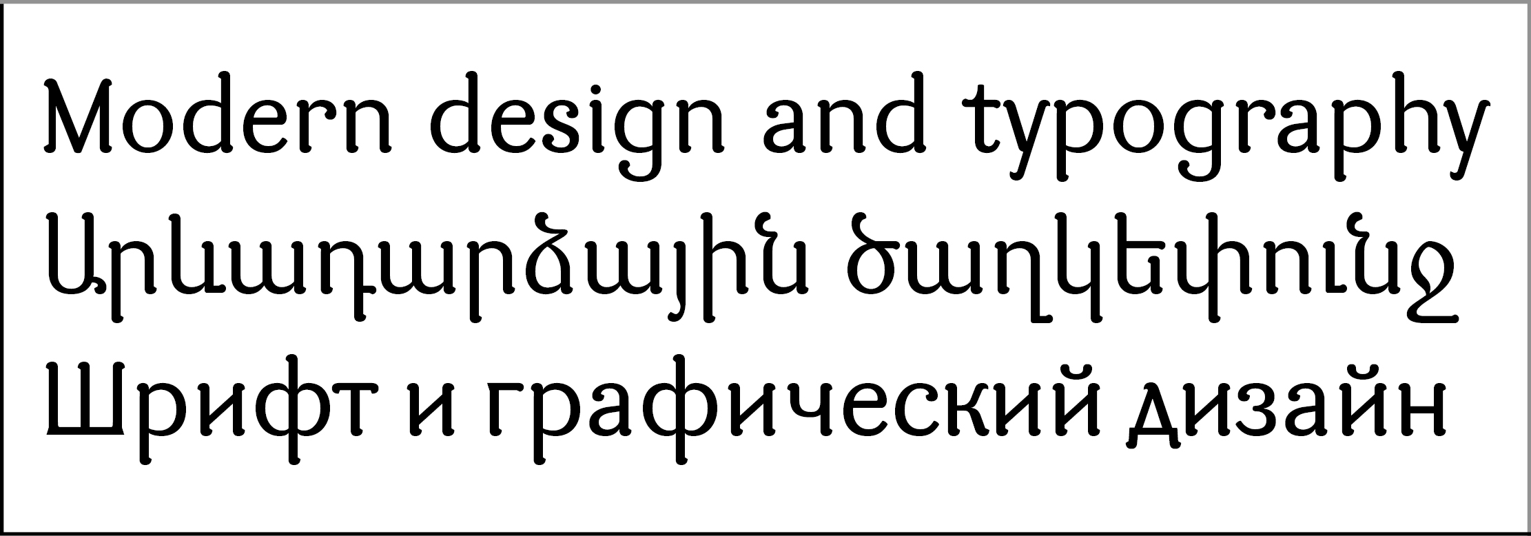 The typeface supports Armenian, Cyrillic, and Latin (Central European) language systems. It includes a rich set of basic and advanced ligatures for both Latin and Armenian, ensuring smooth, elegant typography.
